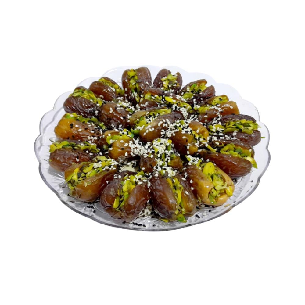 تمر فاخر محشي بأجود أنواع المكسرات، مزين بلمسة رائعة من السمسم وحبة البركة لإضافة نكهة مميزة. مزيج فريد يجمع بين الطعم الغني والفوائد الغذائية، متعة فاخرة لكل محبي التمر والمكسرات، مثالي للتقديم في المناسبات أو كهدية راقية.المكونات:فستق مبشور